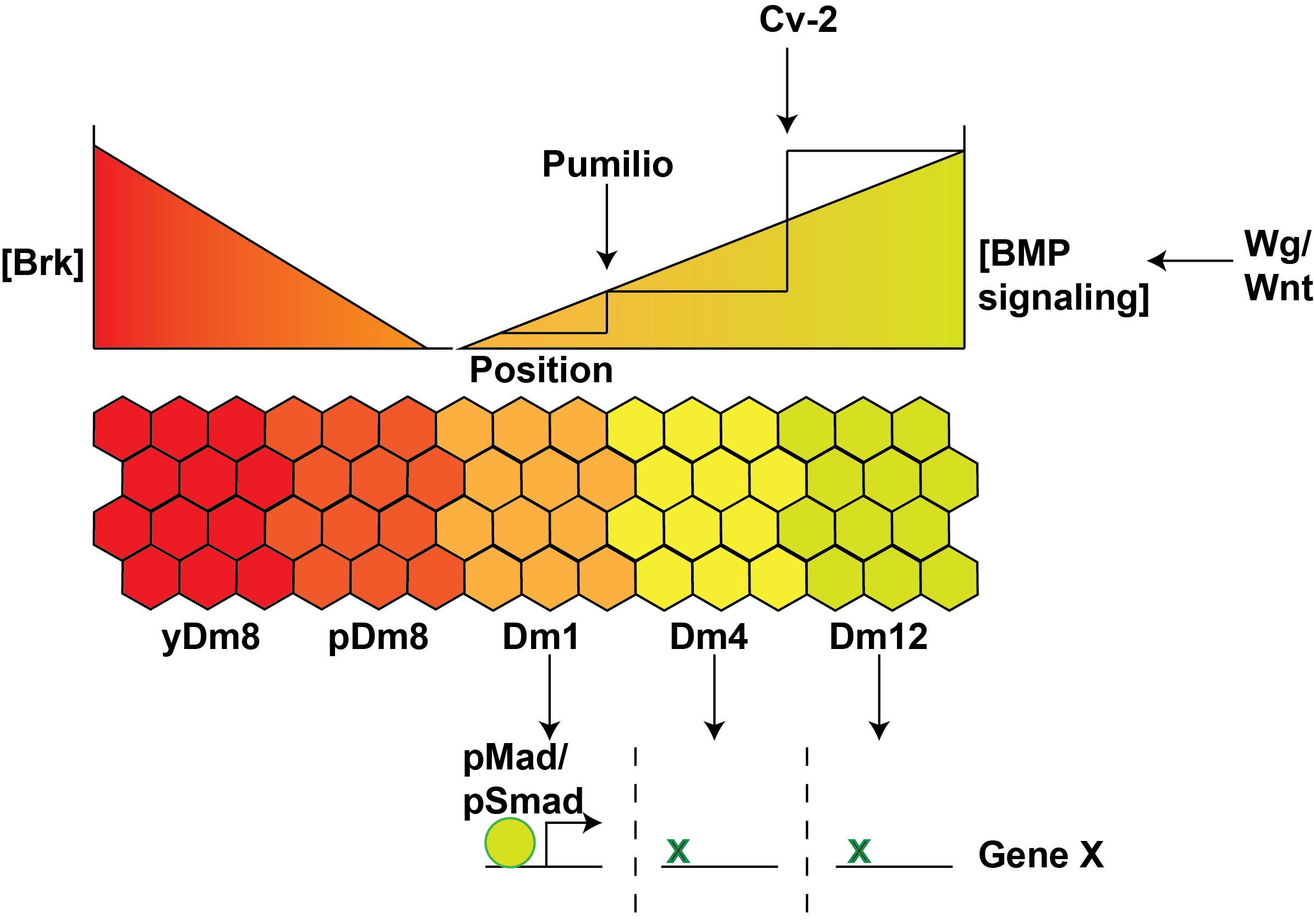 Although the concentration of Dpp is sufficient to distinguish these similar cell types, it is not known what factors act downstream of Dpp to promote cell fate. Nor is it known how the levels of Dpp itself are titrated to allow for a reproducible cell fate outcome.